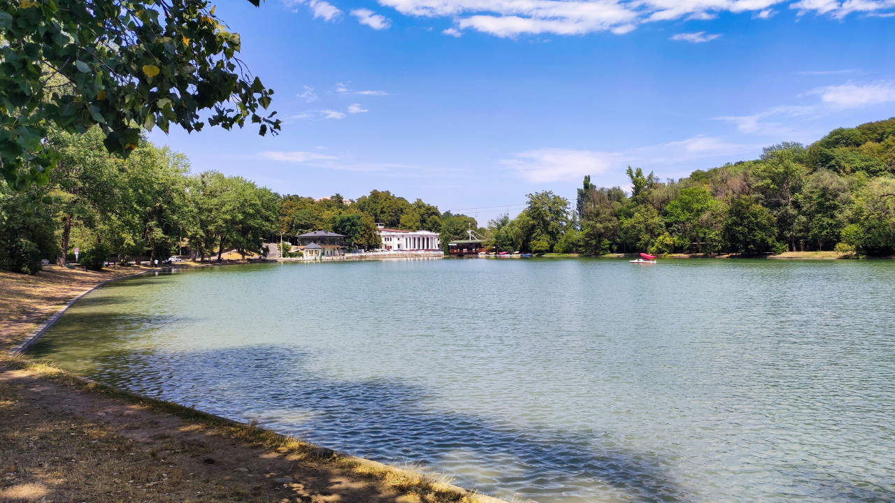 На фото озеро «Трек» в парке «Атажукинский сад»: вода с лёгкой рябью, зелёная береговая линия и элементы инфраструктуры на дальнем берегу, включая здания и зону прогулок. В кадре различимы катамараны, характерные для лодочной станции и проката, работающего на озере в тёплое время года. Озеро является искусственным водоёмом, появившимся на карте Нальчика в 1913 году; питается водами реки Нальчик и имеет уровень выше реки. С 1925 года здесь располагалась городская ГЭС, а водоём служил водохранилищем; позднее на месте появился гостиничный комплекс «Трек» с одноимённым рестораном. Фото подходит для туристических статей, путеводителей и материалов о городской рекреации.