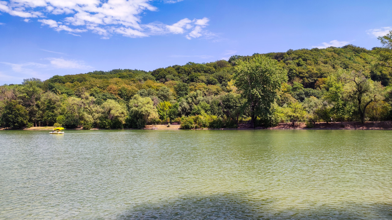 Озеро «Трек» с катамараном у лесистого склона в Нальчике