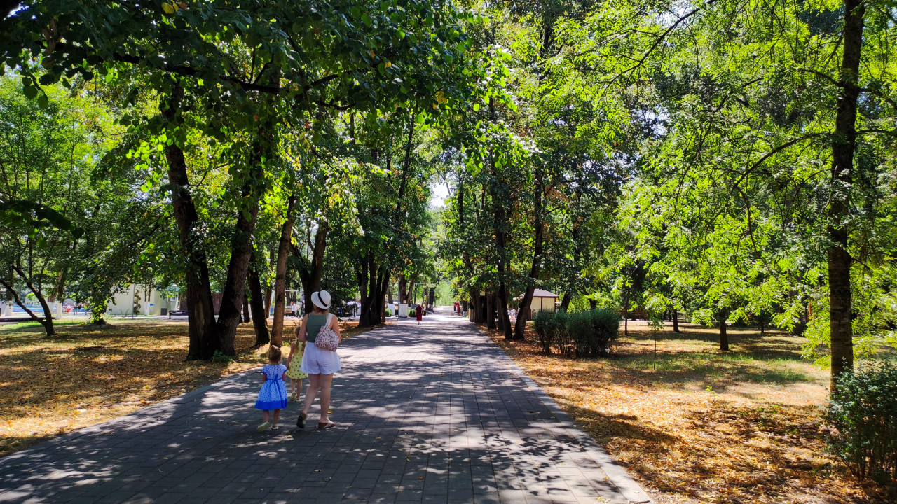 Женщина с двумя детьми идёт по тенистой аллее городского парка