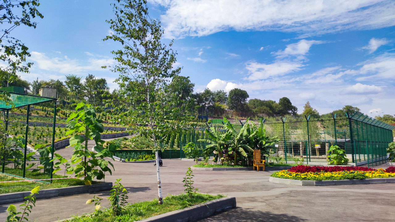 природа город парк общественное пространство городская среда ландшафт благоустройство инфраструктура зелёная зона деревья зелень прогулка отдых рекреация городской парк Городской парк Нальчика Нальчик Кабардино Балкария Россия зоопарк Нальчикский зоопарк вольеры сетчатый вольер ограждение асфальтовая дорожка развилка берёза озеленение террасы склон посадки клумба цветы бархатцы банан тропические растения деревянное кресло посетители лето дневной свет туризмПохожие фотографии