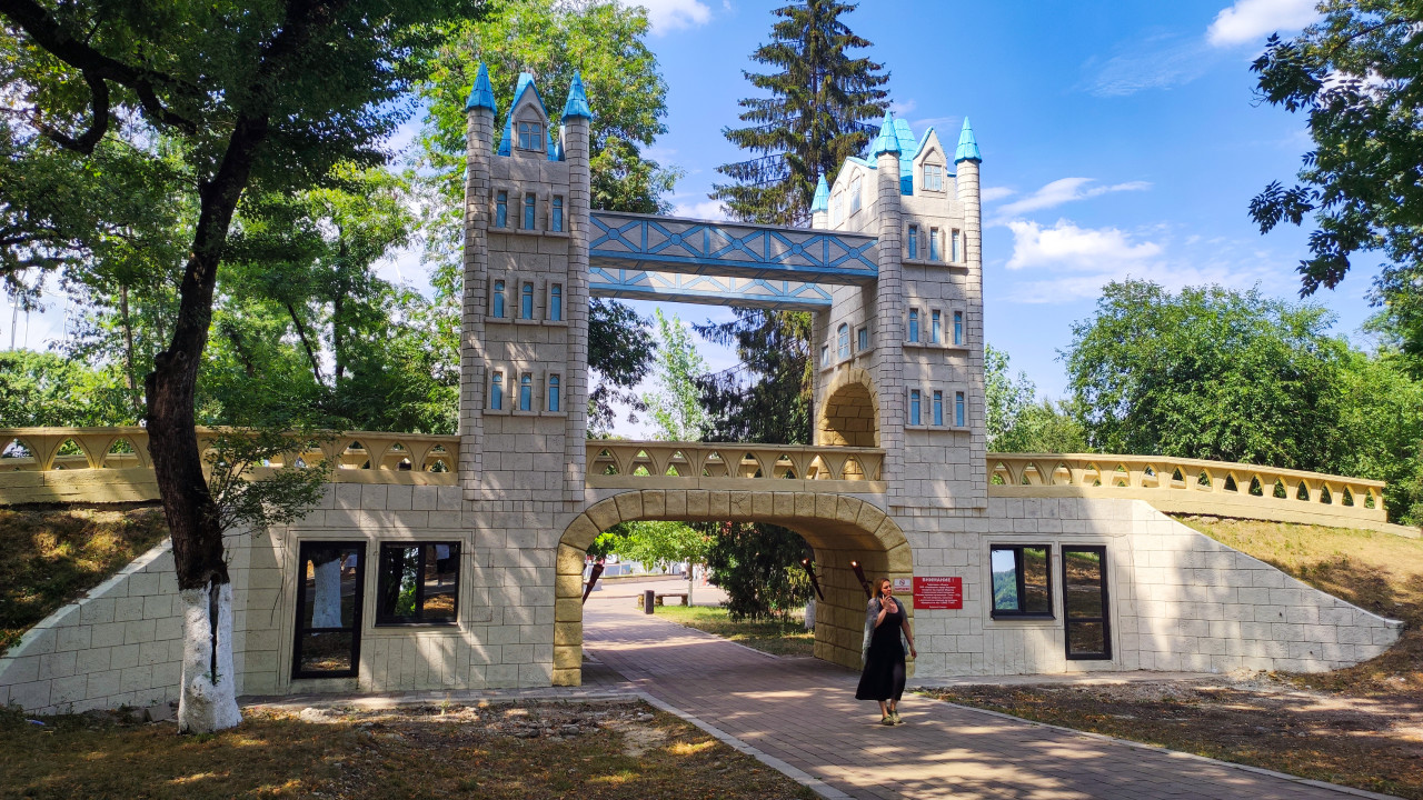 природа город парк общественное пространство городская среда ландшафт благоустройство инфраструктура зелёная зона деревья зелень прогулка отдых рекреация городской парк Городской парк Нальчика Нальчик Кабардино Балкария Россия парковая архитектура декоративная арка башни мост стилизация Tower Bridge голубые крыши шпили арочный проход пешеходная аллея тротуарная плитка окна двери информационная табличка тень лето дневной свет прохожие фотолокация достопримечательность туризмПохожие фотографии