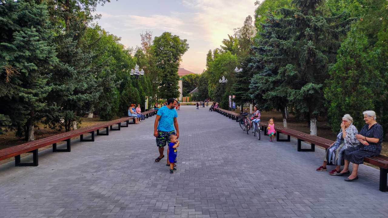 природа город парк общественное пространство городская среда ландшафт благоустройство инфраструктура зелёная зона деревья зелень прогулка отдых рекреация Прохладный Кабардино Балкария Россия аллея пешеходная дорожка тротуарная плитка лавочки скамейки семейный отдых люди мужчина ребёнок пожилые люди общение вечер закат лето фонари велосипеды хвойные деревья озеленение досуг повседневная жизньПохожие фотографии