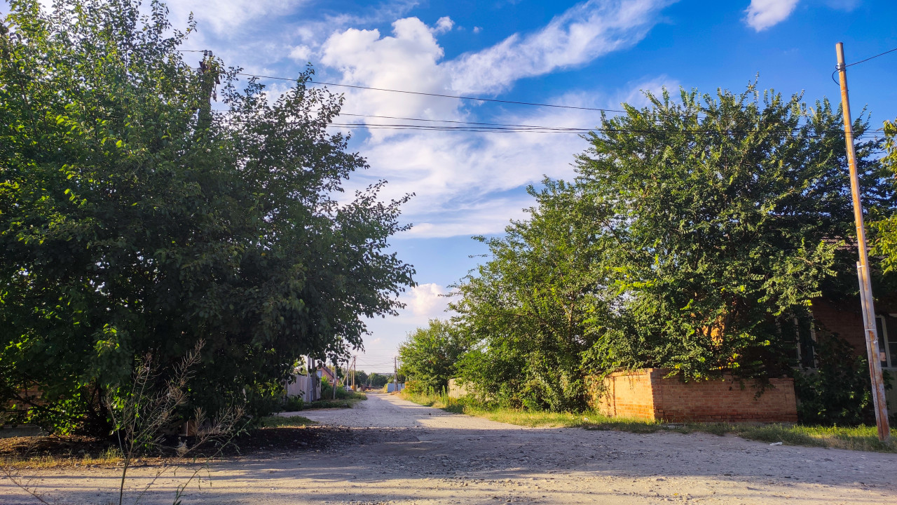 В кадре показана прямая грунтовая дорога, уходящая в перспективу между зелёными деревьями и ограждениями частных участков. Справа тянется кирпичный забор и кустарник, слева плотная крона дерева создаёт глубокую тень на обочине. Над дорогой проходят провода линии электропередачи, виден уличный столб и фрагменты домов вдалеке. Небо голубое, с крупными облаками, освещение тёплое дневное. Снимок сделан летом, в июле 2024 года. Подходит для иллюстраций о загородной инфраструктуре, спокойных улицах, путешествиях и жизни в провинции.