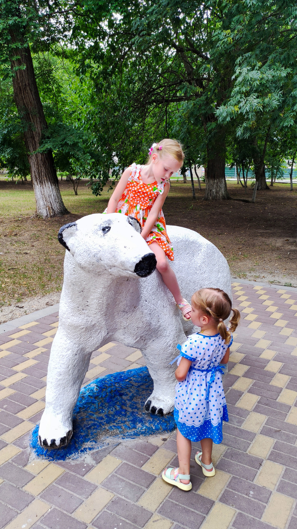 люди дети семья детство быт повседневная жизнь досуг девочки семейный отдых прогулка парк городской парк скульптура белый медведь декоративная фигура уличная зона игровая сцена лето дневной свет природа деревья зелень плитка мощение детская площадка общение игра радость выходные семейные ценности городская среда отдых на улицеПохожие фотографии