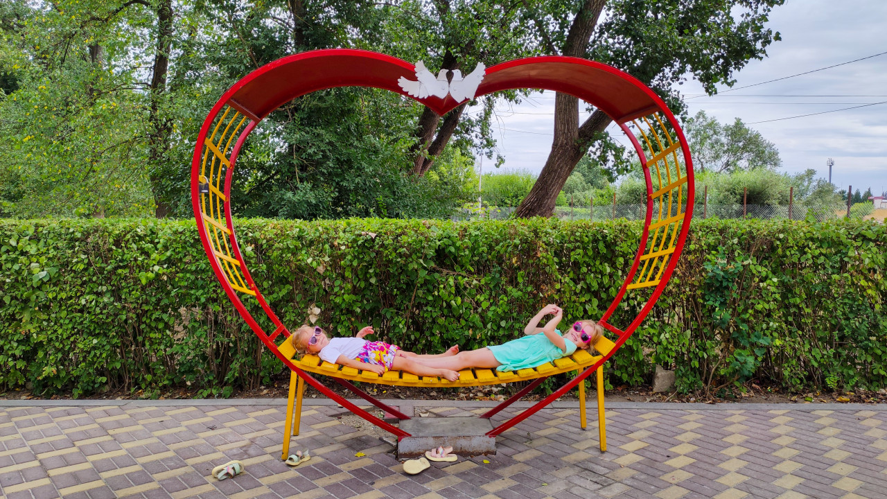 люди дети семья детство быт повседневная жизнь досуг семейный отдых город Комсомольский парк Комсомольский парк Прохладного Прохладный Кабардино Балкария Россия качели качель лежак фотозона сердце арт объект парковая мебель общественное пространство благоустройство тротуарная плитка живая изгородь деревья лето дневной свет прогулка отдых на природе детские каникулы городская среда паркПохожие фотографии