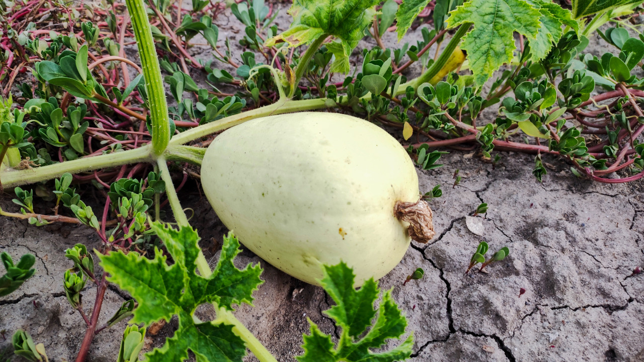 Крупный план плода дыни светлой окраски, лежащего на растрескавшейся сухой почве. Видны место крепления плода к плети, подсохший остаток цветка на конце и толстый стебель с узлом. Вокруг находятся листовые пластины бахчевой культуры и низкие растения на поверхности грунта, создающие фактурный природный фон. По состоянию почвы и освещению кадр выглядит как летняя съёмка (июль) на открытой грядке. Фотография показывает стадию незрелого плода до набора характерной окраски и может использоваться в материалах о выращивании дыни, проблемах засухи, дачном земледелии, агротехнике бахчевых и сезонном сборе урожая.