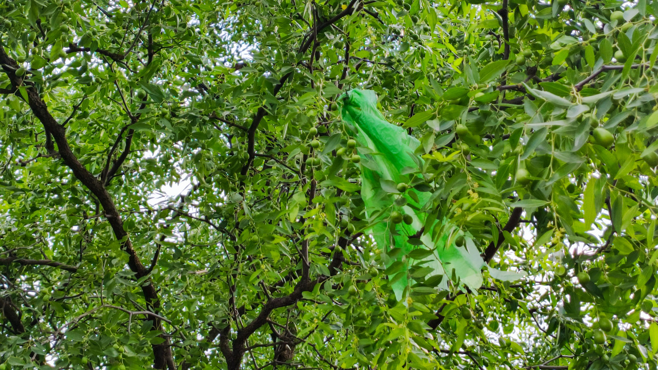 Зелёный пластиковый пакет зацепился за ветви плодового дерева
