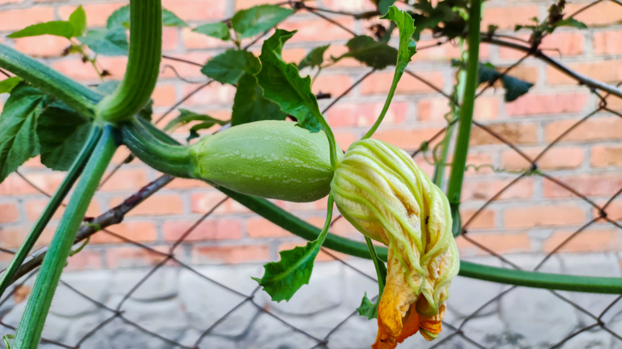 природа растение огород дача приусадебный участок овощи листья стебель выращивание уход за растениями садоводство сельское хозяйство домашний урожай лето кабачок тыквенные завязь формирование плода цветок увядающий цветок плеть плодоножка усики садовые культуры агротехника июль дневной свет сетка рабица забор кирпичная кладкаПохожие фотографии