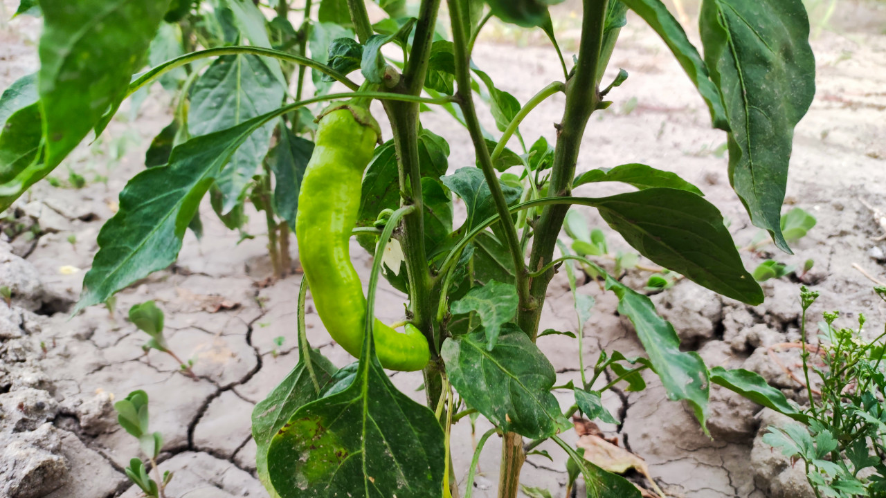 На фото показан длинный зелёный плод острого перца, свисающий на кусте среди тёмно-зелёных листьев. Стебель подвязан к опоре, рядом видны боковые побеги и листья с естественными следами роста. Фон размытый: растрескавшаяся почва, молодые всходы и другие растения на грядке, что указывает на приусадебный огород. Съёмка сделана летом (июль) при дневном естественном свете и фиксирует стадию технической зрелости, когда перец ещё не сменил окраску. Изображение подходит для статей о выращивании перца, дачном хозяйстве, домашнем урожае, здоровом питании и сельскохозяйственных культурах.