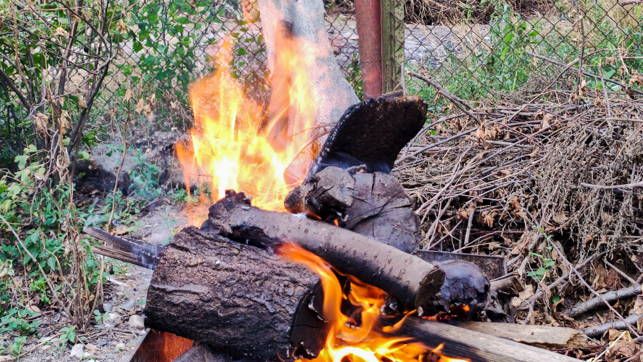 Июль 2024. Крупный план костра: сверху на дровах лежит толстое полено с корой, рядом видны обугленные края древесины и яркое пламя, уходящее вверх. На фоне читается сетчатый забор и сухая куча веток, что создаёт ощущение садового участка и хозяйственных работ. В кадре заметны следы копоти, тлеющие участки и лёгкий дым, подчёркивающие процесс горения и высокую температуру. Фото можно использовать в материалах про разведение костра, дачный быт, утилизацию веток, сезонную уборку участка и темы пожарной безопасности; подходит для статей, памяток и иллюстраций про отдых на природе.