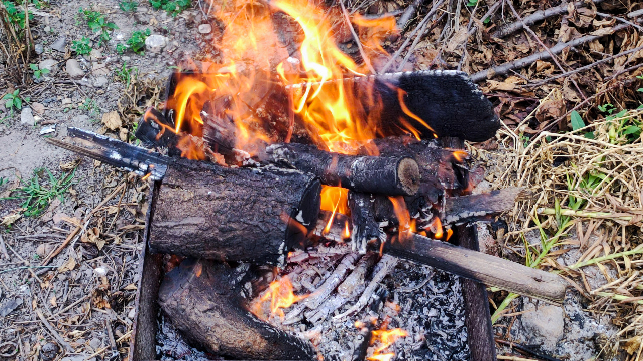 Июль 2024. Съёмка сверху на квадратный металлический мангал: внутри лежат горящие поленья и тонкие щепки, между ними видно яркое пламя, а по дну распределён слой золы и углей. Края жаровни потемневшие от копоти, на поленьях заметны обугленные участки и трещины коры. Вокруг мангала видна земля, сухая трава и растительный мусор, что создаёт ощущение дачного двора. Кадр подойдёт для иллюстраций про готовку на огне, пикники, походную кухню, разведение костра и соблюдение пожарной безопасности, а также для бытовых сюжетов о жизни за городом.