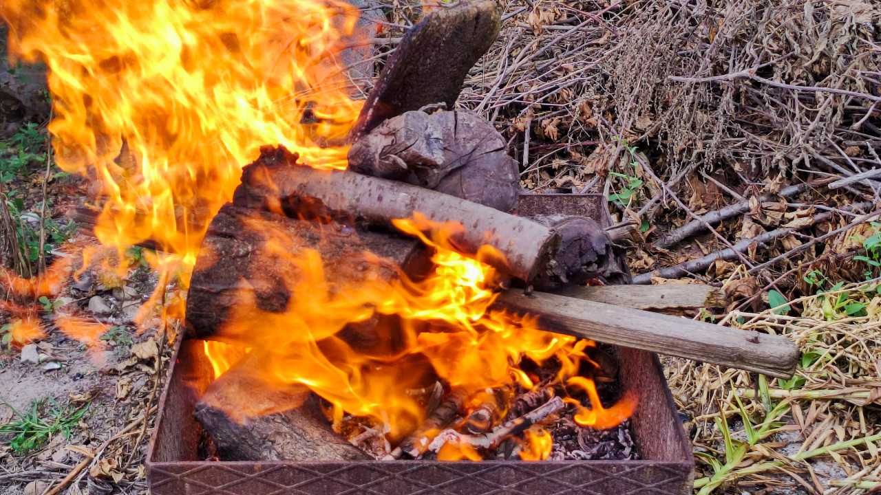 В кадре металлическая жаровня с горящими поленьями: слева высокий язык пламени уходит вверх, внизу видны красные угли и тлеющие остатки древесины. Сверху лежит короткое полено и бревно с трещинами от жара, рядом заметны сухие ветки и листья, подготовленные для уборки. Съёмка выполнена с близкой дистанции, акцент на динамике огня и фактуре дров. Фото подойдёт для тем о дачном быте, утилизации растительных отходов, сезонной расчистке участка, а также для иллюстраций о рисках открытого огня и мерах предосторожности.