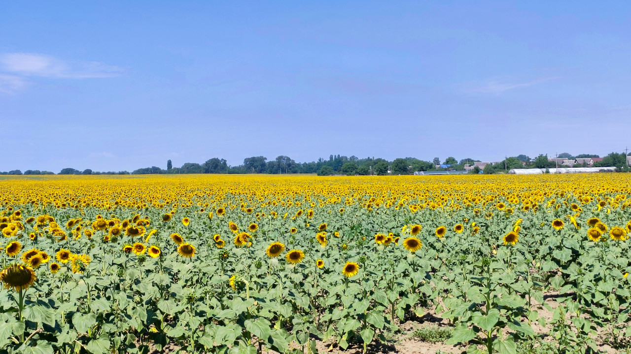 На снимке крупная перспектива поля подсолнечника: в передней части видны отдельные головки цветов и ряды растений, дальше жёлтая масса уходит к горизонту. Справа на дальнем плане заметны белые дуги теплиц и хозяйственные постройки рядом с линией деревьев. Небо светлое, с мягкими облаками, освещение дневное, без выраженных теней. Композиция передаёт масштаб посевов и сельскую инфраструктуру вокруг полей. Фотография подойдёт для материалов о фермерстве, растениеводстве, сезонных работах и аграрной экономике.