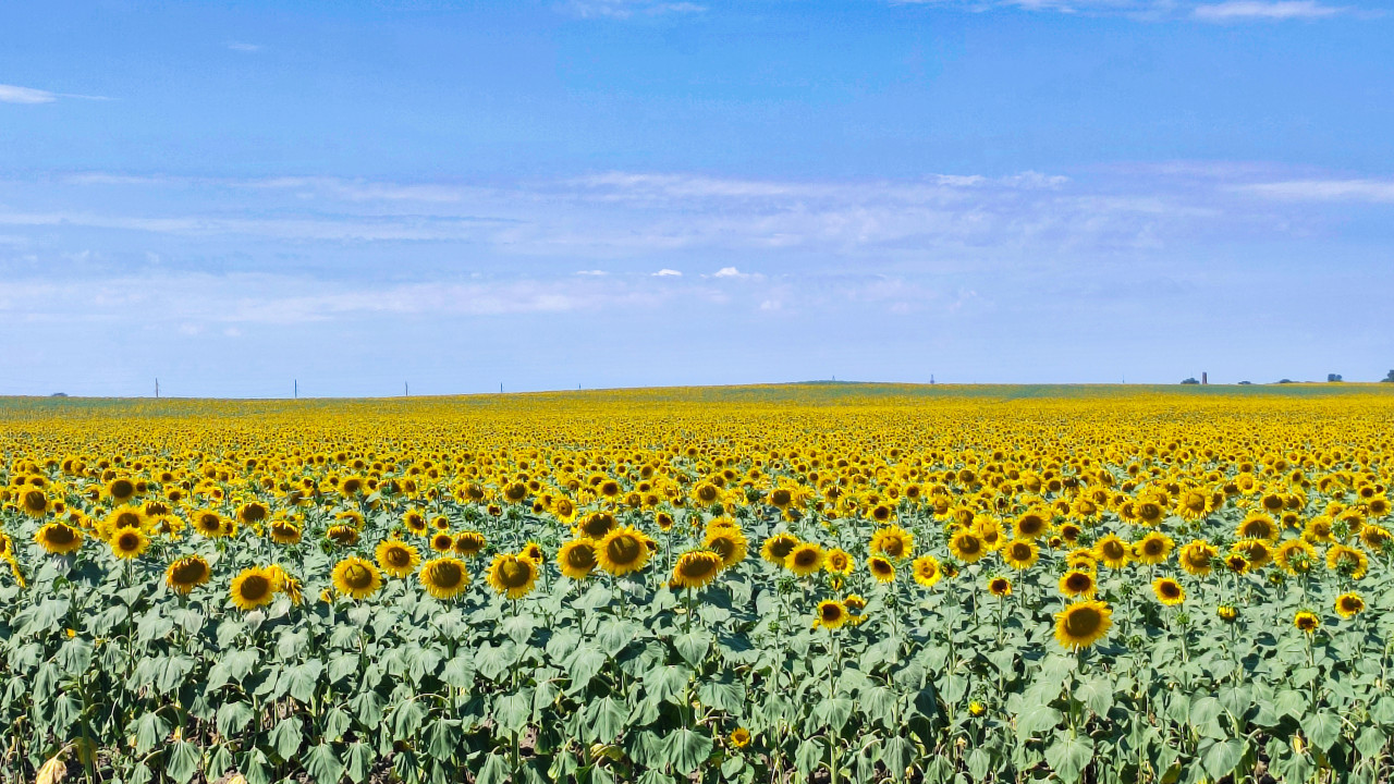 Фотография показывает ровное цветущее поле подсолнечника, заполняющее почти весь кадр от переднего плана до линии горизонта. Жёлтые корзинки равномерно распределены по посадкам, между рядами видна сухая земля. На горизонте просматриваются тонкие опоры линий электропередачи, подчёркивающие сельскую равнину и удалённость. Небо занимает большую часть кадра: светло-голубой фон с вытянутыми облаками создаёт ощущение простора и тишины. Снимок подходит для тем про сельский пейзаж, аграрные территории, экологию и сезон цветения подсолнечника.