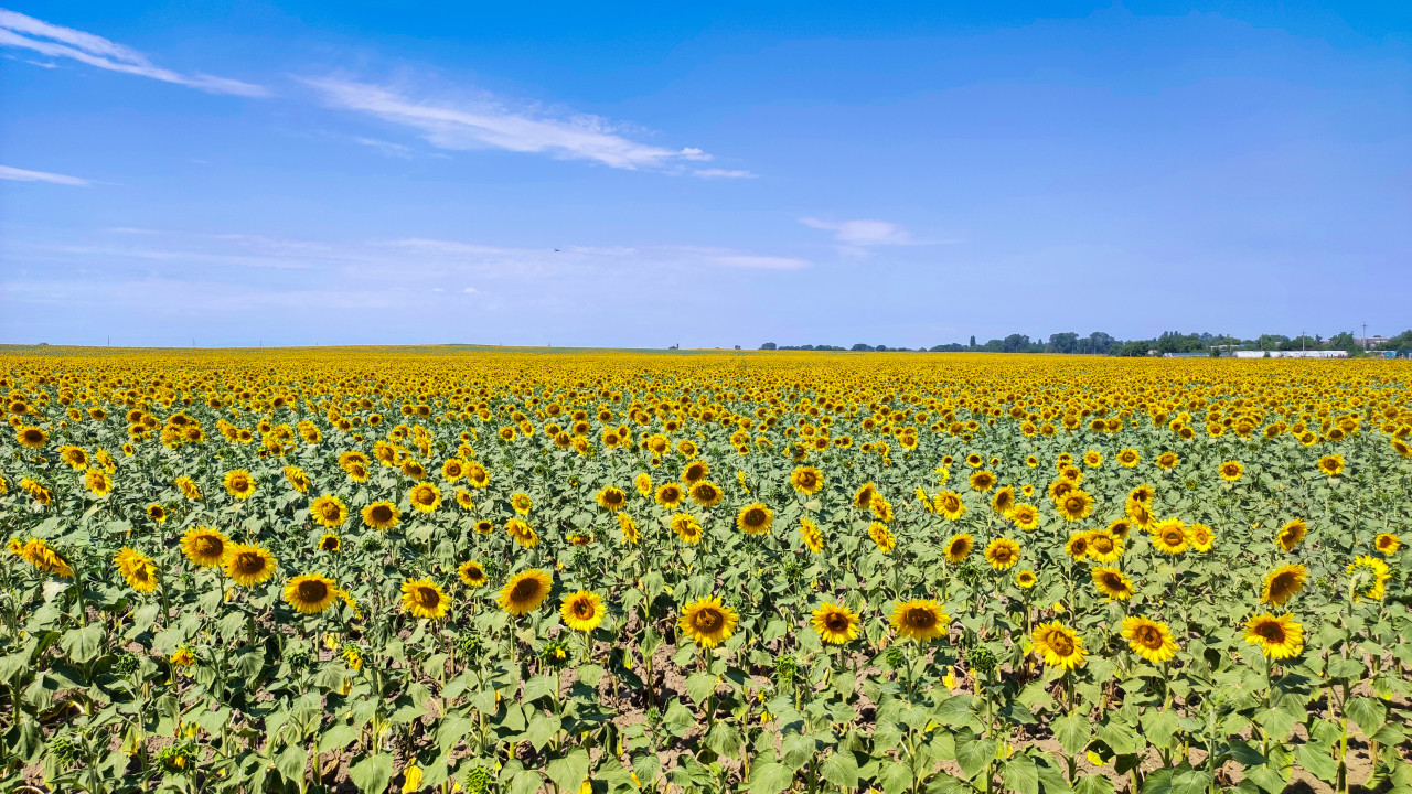природа пейзаж сельская местность поле сельское хозяйство растениеводство подсолнечник поле подсолнечника цветение жёлтые цветы зелёные листья ряды растений горизонт небо облака цветущие подсолнечники крупные цветы передний план жёлтые лепестки корзинка сухая почва деревня сельские постройки теплицы деревья лето дневной свет голубое небо простор аграрный ландшафт масличные культуры урожай фермерствоПохожие фотографии