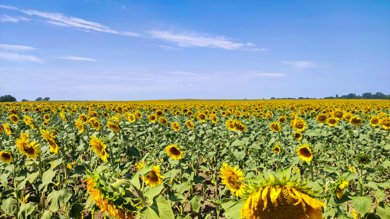 природа пейзаж сельская местность поле сельское хозяйство растениеводство подсолнечник поле подсолнечника цветение жёлтые цветы зелёные листья ряды растений горизонт небо облака лето агро фермерство панорама голубое небо солнечный день солнечный свет подсолнух подсолнухи жёлтый цвет растение масличные культуры урожай плантация стебли соцветия цветочное поле натуральный фон копи спейсПохожие фотографии