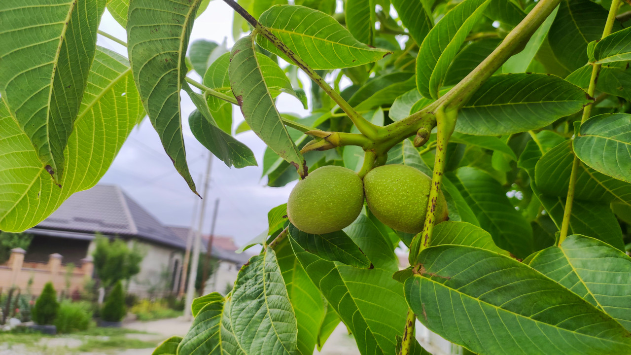 Фрагмент кроны орехового дерева: два зелёных грецких ореха расположены рядом и освещены мягким дневным светом. Листья крупные, с чёткими прожилками, местами заметны небольшие подсохшие края и точечные пятна на побегах. На заднем плане угадываются забор, крыша дома и опоры с проводами, небо затянуто облаками, что создаёт ровное освещение без жёстких теней. Снимок подходит для статей о дачном участке, плодовых культурах и сезонных работах в саду.