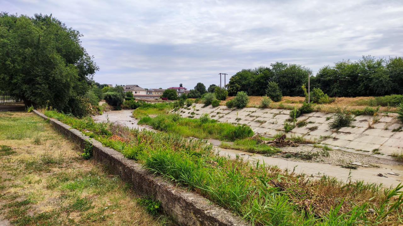 природа пейзаж водоём река русло реки берег течение бетон бетонные плиты берегоукрепление прибрежная растительность кустарники деревья экология инфраструктура Малка река Малка Прохладный Кабардино Балкария Россия левый приток Терека бетонные берега бетонированное русло гидротехническое сооружение отмель мелководье зелёные заросли сухая трава частный сектор дома пригород линии электропередач лето июльПохожие фотографии