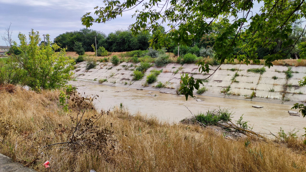 На фото показан участок реки Малка в городе Прохладный: поток мутной воды проходит по укреплённому бетонными плитами руслу. По откосам заметны швы плит, между ними проросли травы и кусты; передний план занимает сухая жёлтая растительность и ветки, верх кадра обрамляют листья дерева. На противоположном берегу видна полоса зелени, столбы и дальние строения. Освещение мягкое, летнее (июль), небо с облаками. Снимок подходит для материалов о реках России, гидротехнических сооружениях, экологии городских водотоков и ландшафтах Кабардино-Балкарии.