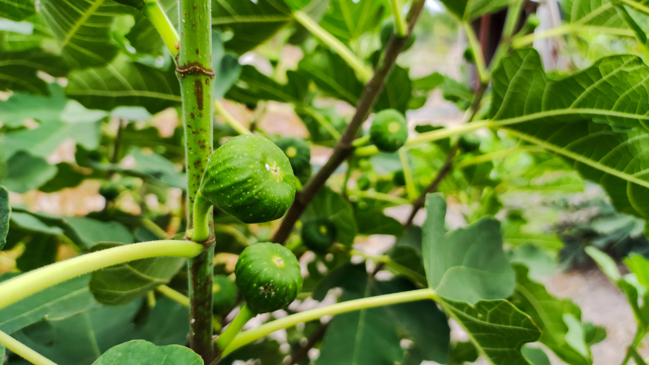 Крупный план ветки инжира: на зелёных побегах видны несколько небольших незрелых плодов шаровидной формы, рядом крупные лопастные листья с выраженными жилками. В глубине кадра листва размыта, что подчёркивает фактуру плодов и поверхность стебля. Освещение дневное, мягкое, без жёсткого контраста. Фото подходит для материалов о субтропических растениях, ботанике, садоводстве, сезонном созревании фруктов и как природный фон для дизайна.