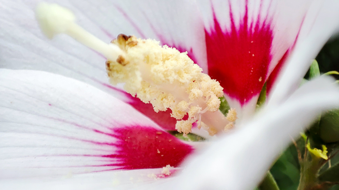 Макрофотография центральной части цветка садового гибискуса: крупно показаны тычинки и пестик, покрытые зернистой жёлтой пыльцой. По краям кадра видны белые лепестки с яркими малиновыми пятнами у основания, фон мягко размыт для акцента на фактуре. Съёмка выполнена на улице в саду в июле 2024 года, заметны мельчайшие частицы пыльцы и строение цветка. Изображение подходит для учебных и научпоп материалов о растениях, опылении, макросъёмке и ботанике.