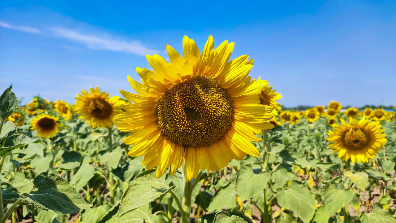природа растения цветы цветение флора ботаника лепестки листья лето подсолнух подсолнухи поле растение соцветие семенная корзинка жёлтый цвет зелёные листья стебель сельское хозяйство агро агробизнес масличные культуры фермерство плантация урожай сельская местность пейзаж горизонт голубое небо облака солнечный день естественный свет копи спейсПохожие фотографии