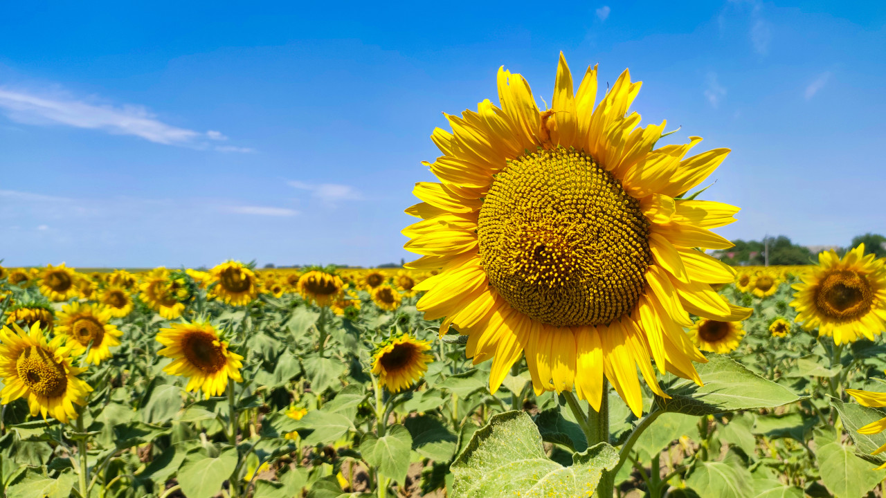 На переднем плане выделен подсолнечник с крупной корзинкой и ровным венчиком лепестков; соцветие смещено вправо, что оставляет пространство для поля и неба. В средней зоне кадра видны многочисленные подсолнухи, образующие плотные ряды, зелёные листья создают фактурный фон. Линия горизонта низкая, сверху доминирует яркое синее небо без плотной облачности, освещение контрастное дневное, характерное для ясного летнего дня. Снимок подойдёт для иллюстраций про сельхозпроизводство, сезонные поля, натуральное масло, экологичные продукты и летние баннеры.