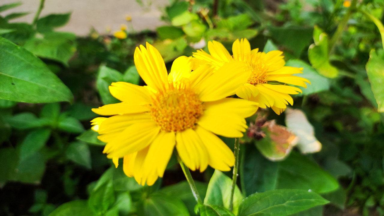 На фото два ярко-жёлтых цветка с широкими лепестками и плотной серединкой, снятые на уровне соцветий. Передний цветок частично перекрывает второй, фон состоит из зелёных листьев и стеблей, размытых из-за небольшой глубины резкости. Освещение естественное, тёплое, характерное для летнего дня; по визуальным признакам съёмка выполнена в июле на садовом участке или в цветнике. Кадр подчёркивает контраст жёлтого и зелёного и подходит для тем про садовые растения, летнее цветение, флористику, природные фоны и оформление сезонных материалов.