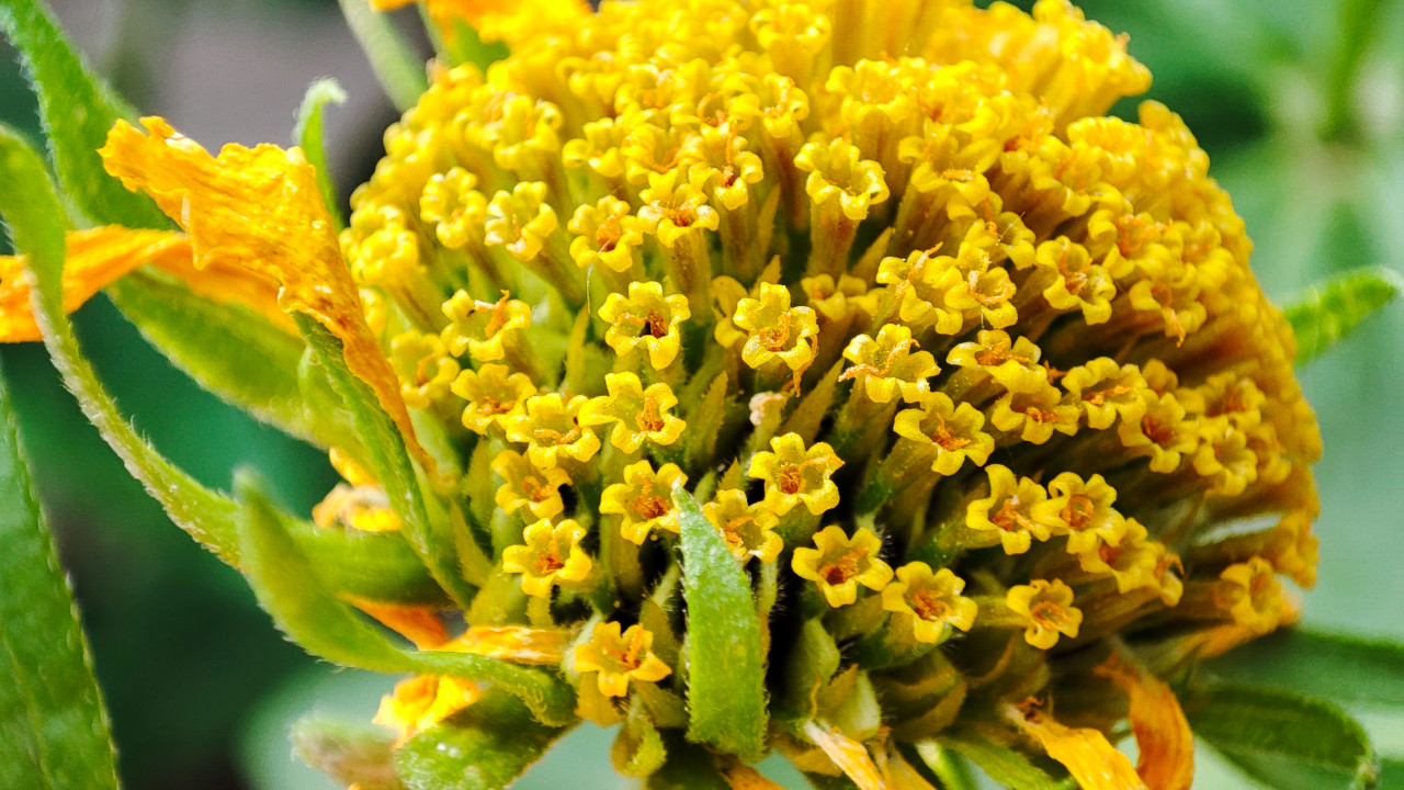 Крупный план жёлтого соцветия: в кадре плотная «шапка» из множества мелких трубчатых цветков с тёмными центрами, вокруг видны зелёные прицветники и подсохшие лепестки по краям. Фон размыт, читаются зелёные листья и мягкие переходы цвета, что указывает на съёмку с малой глубиной резкости в саду. Освещение естественное дневное, без жёстких теней. Фото подойдёт для иллюстраций о садоводстве, ботанике, макромире, текстурах растений и сезонных материалах о цветниках.