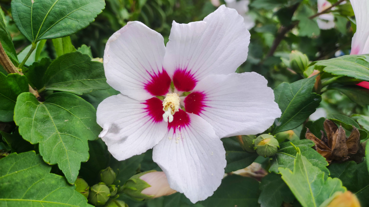 Крупный план одного раскрытого цветка садового гибискуса: белые лепестки с выраженными жилками и контрастная малиновая зона вокруг тычинок. В кадре также видны зелёные листья с зубчатым краем, бутоны и фрагменты соцветий на фоне куста. Съёмка выполнена на улице в саду в июле 2024 года, фокус на центральной части цветка и деталях пыльцы. Фото подходит для материалов о декоративных растениях, ботанике, сезонном цветении и садовом дизайне.