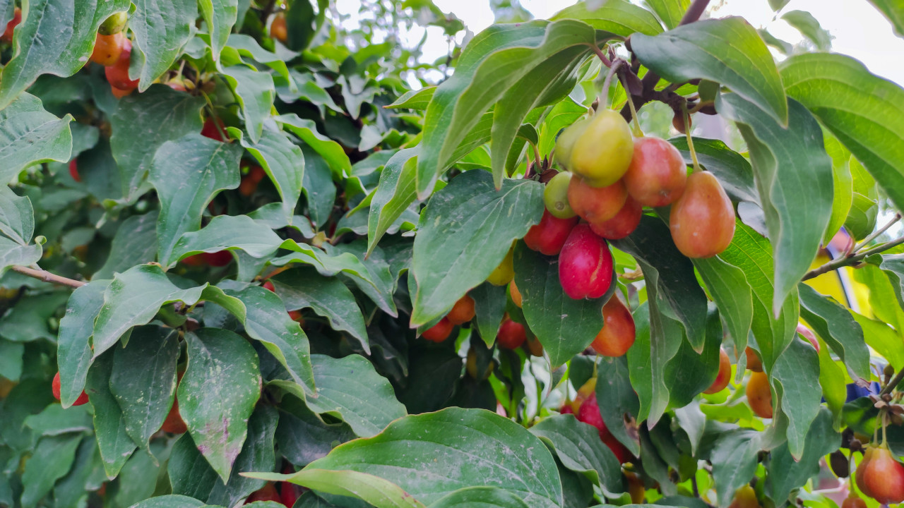 природа растения кустарник плодовый кустарник кизил ягоды плоды ветка листья зелёная листва урожай садоводство дерен фрукты созревание разные стадии зрелости сад красные ягоды оранжевые плоды зелёные плоды крупный план макро глубина резкости натуральные продукты витамины сезонные фрукты заготовки варенье сок десерты фермерские продуктыПохожие фотографии