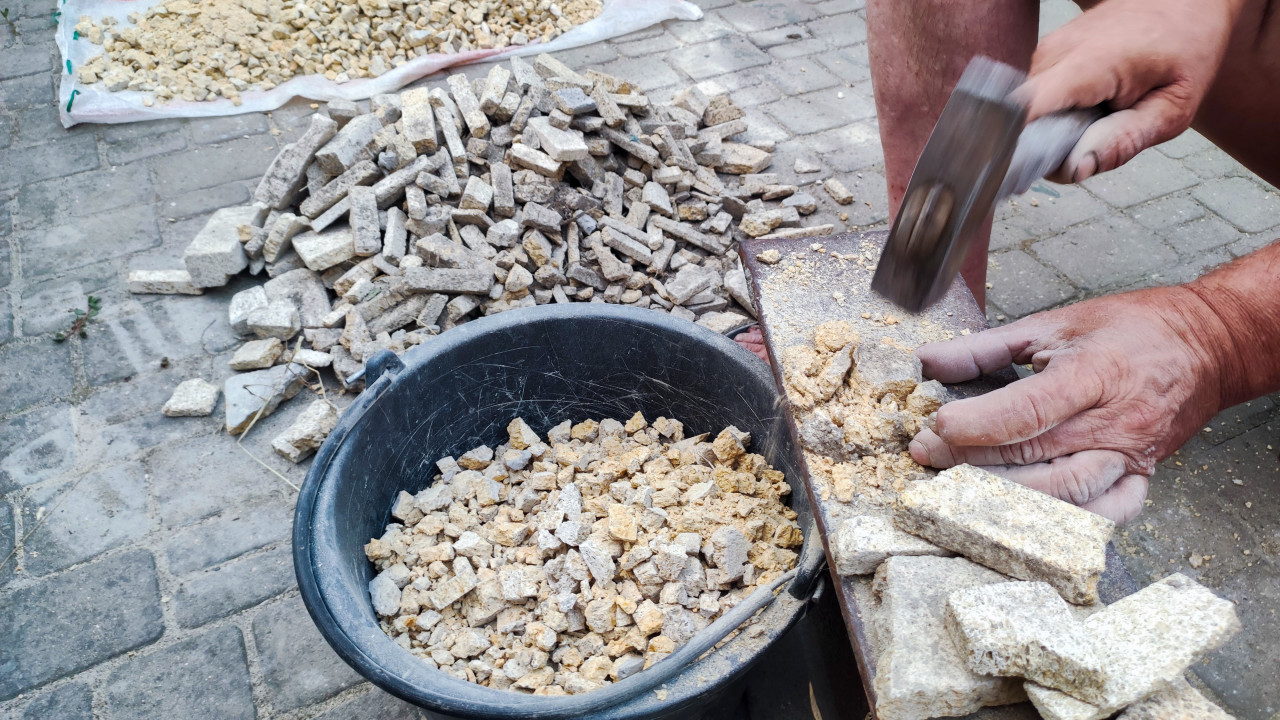 строительство ремонт благоустройство ручной труд рабочие руки инструмент молоток кувалда камень щебень строительные материалы дробление демонтаж переработка материалов стройплощадка разборка бетон измельчение переработка вторсырье строительные отходы пластиковый таз тротуарная плитка двор подготовка основания укладка плитки реконструкция крупный план процессПохожие фотографии