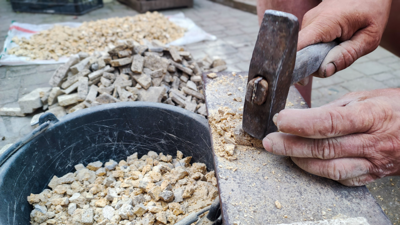 строительство ремонт благоустройство ручной труд рабочие руки инструмент молоток кувалда камень щебень строительные материалы дробление демонтаж переработка материалов стройплощадка дробление камня каменная крошка подготовка материалов переработка брусчатка тротуарная плитка мощение ведро пыль безопасность труда мастер мастерская двор работы на участке ремонтные работы производственный процесс крупный планПохожие фотографии