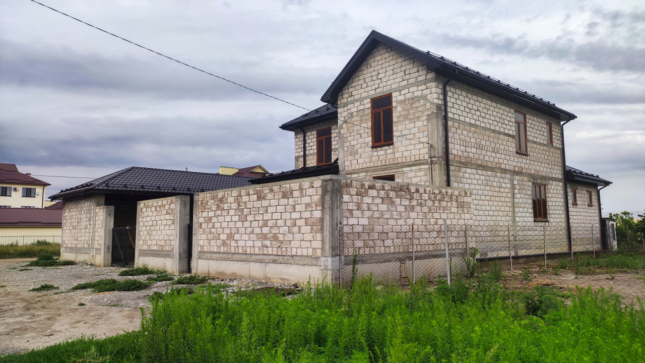 Уличный вид на частный жилой участок: двухэтажный дом из светлых строительных блоков с тёмной скатной крышей и установленными окнами. Перед домом высокий забор из блоков и бетона, рядом пристройка или гараж с крышей из металлочерепицы; видны ворота и открытый проём. На переднем плане грунтовая площадка и заросли высокой травы у ограждения, по небу проходят провода, облачность плотная. Съёмка выполнена днём в жилом районе частной застройки. Фото пригодится для тем о строительстве, недвижимости, благоустройстве и пригородной архитектуре.