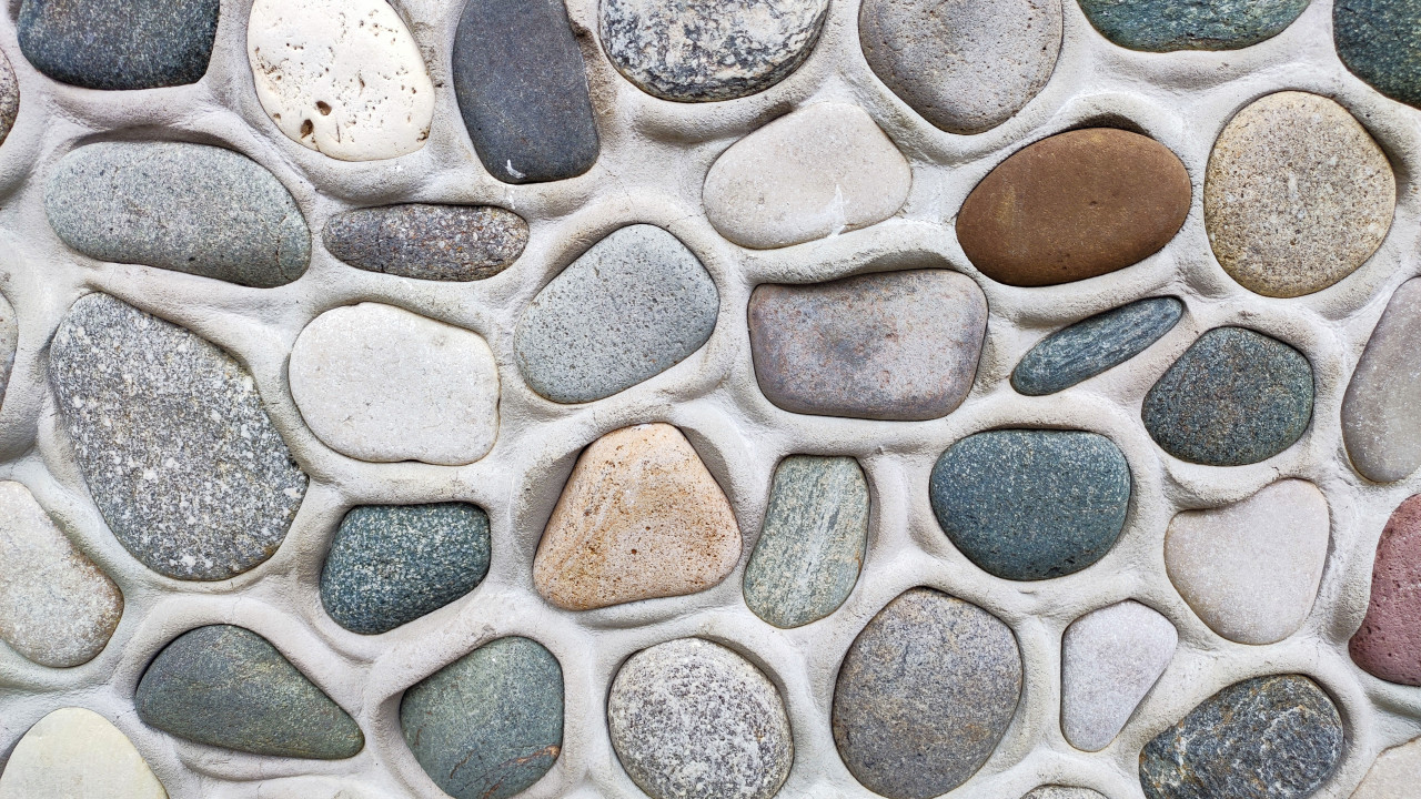 Крупный план стены, облицованной галькой: в светлом растворе уложены камни разной формы от плоских овальных до угловатых, с заметным контрастом оттенков. В кадре присутствуют тёмно-серые и зеленоватые камни, белые включения, а также коричневый овальный элемент, который задаёт акцент. Швы аккуратные, с небольшим рельефом по контуру каждого камня, что подчёркивает объём. Такая фактура характерна для декоративной отделки фасадов, цоколей и садовых стенок. Фото подойдёт как фон и как иллюстрация для тем о строительных материалах, ремонте и благоустройстве.