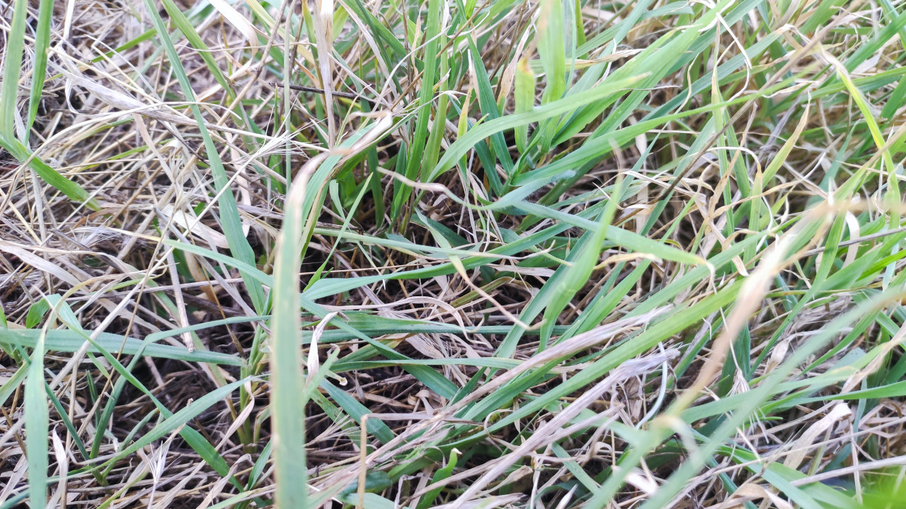 Крупный план травяного покрова: среди сухих бежевых стеблей заметно много свежих зелёных листьев злаков, часть травинок перекрывает друг друга и образует хаотичный рисунок. В кадре есть полегшая сухая трава, тонкие колоски и тёмные просветы почвы между растениями, глубина резкости небольшая. Снимок сделан на улице при естественном свете, без дополнительных объектов, поэтому его удобно использовать как фон. Фото подходит для тем о луговой растительности, сезонных переходах, контрасте свежей и сухой травы, а также для дизайнерских текстур.