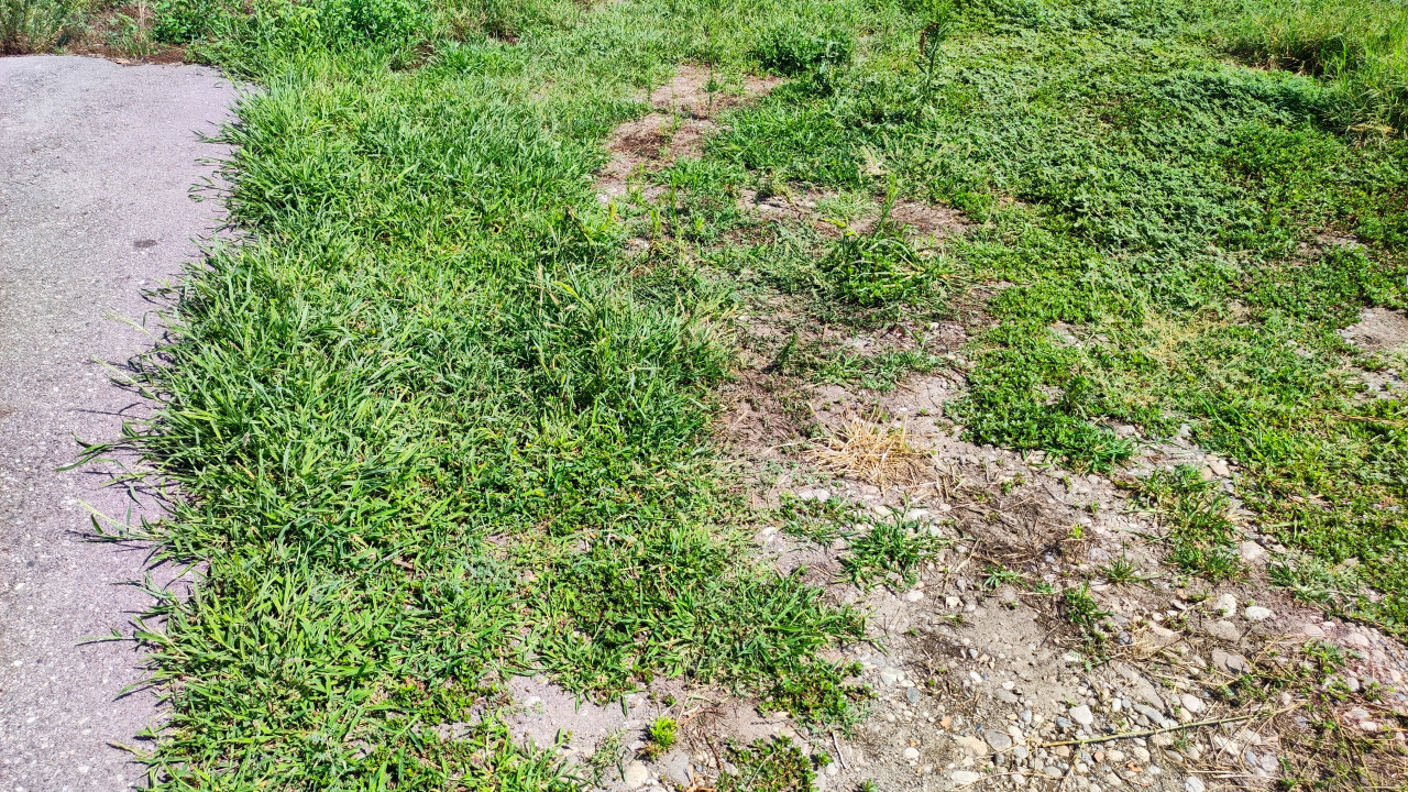 Пятнистая растительность у края тротуара и сухие участки грунта