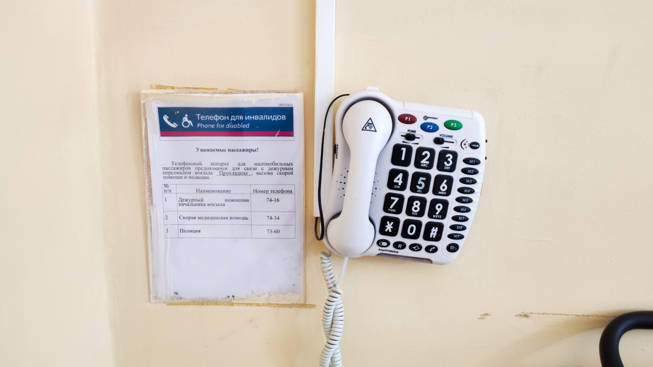 Настенный телефон с крупными кнопками рядом с табличкой «Телефон для инвалидов»