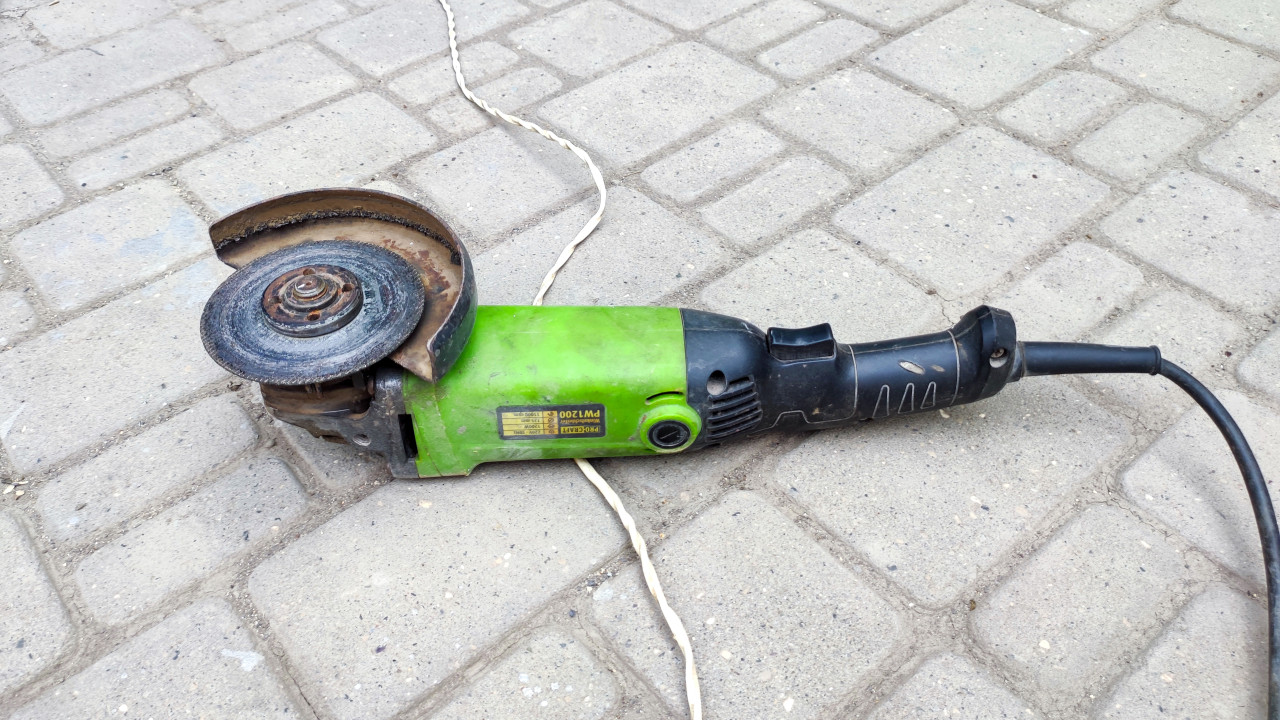 Июль 2024. На тротуарной плитке лежит углошлифовальная машина (болгарка) зелёного цвета с установленным отрезным диском и защитным кожухом, к инструменту подключён кабель питания. В кадре заметны пыль, мелкие частицы мусора и следы ремонтных работ, что указывает на уличную рабочую площадку. Съёмка подчёркивает форму корпуса, диск и элементы управления. Фото подойдёт для материалов про резку металла и камня, строительный инструмент, технику безопасности, ремонт и монтаж, а также для каталогов и инструкций.