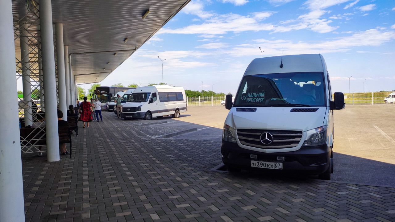 Под навесом остановочного комплекса стоят маршрутные микроавтобусы, один из них в кадре крупно спереди. На лобовом стекле табличка направления «Нальчик – Пятигорск», у борта видны пассажиры и люди в ожидании у лавок. Площадка вымощена бетонной плиткой, слева ряд колонн, справа открытая стоянка и ограждение территории. Небо ясное с облаками, съёмка сделана днём летом. Фотография подойдёт для тем о межгородских перевозках, пассажирском транспорте, инфраструктуре автостанций и путешествиях.