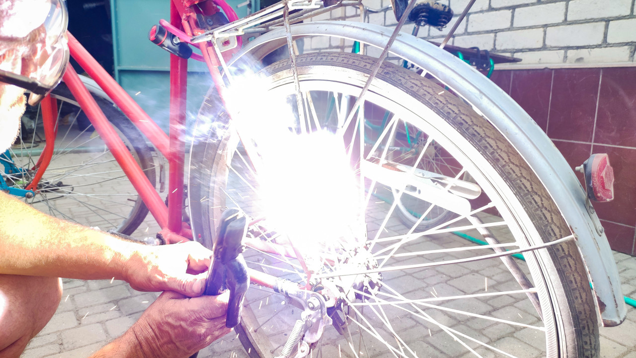 транспорт велосипед велоремонт ремонт ремонт велосипеда велосипедный багажник крепление металл металлоконструкция сварка сварочные работы ремонт металла металлообработка ручной труд инструмент электродуговая сварка дуговая сварка сварочная дуга искры вспышка электрод электрододержатель багажник сварка багажника крепление багажника соединение металла мастер техника безопасности заднее колесо спицы обод заднее крыло рама двор тротуарная плитка кирпичная стенаПохожие фотографии