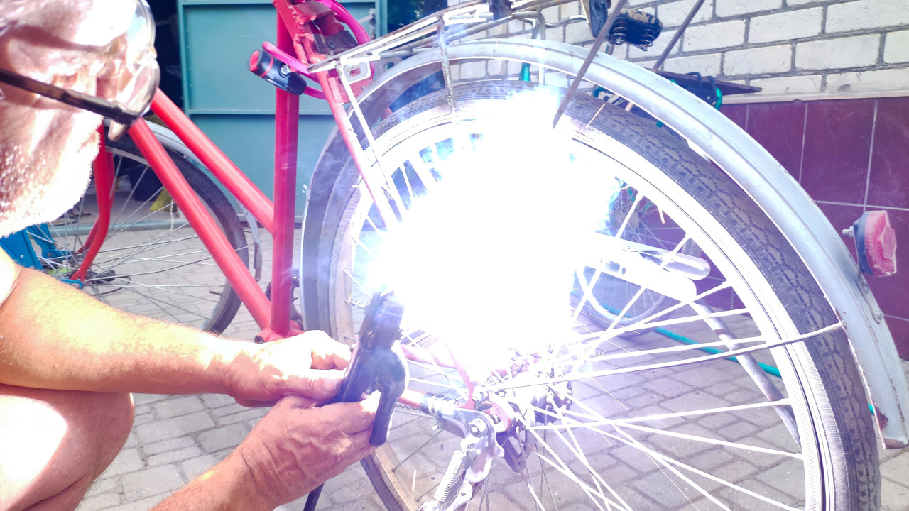 транспорт велосипед велоремонт ремонт ремонт велосипеда велосипедный багажник крепление металл металлоконструкция сварка сварочные работы ремонт металла металлообработка ручной труд инструмент дуговая сварка электросварка вспышка сварочная дуга искры дым электрод электрододержатель защитные очки техника безопасности мастер багажник сварка багажника крепёж опоры багажника соединение металла заднее колесо спицы обод крыло двор тротуарная плитка кирпичная стенаПохожие фотографии