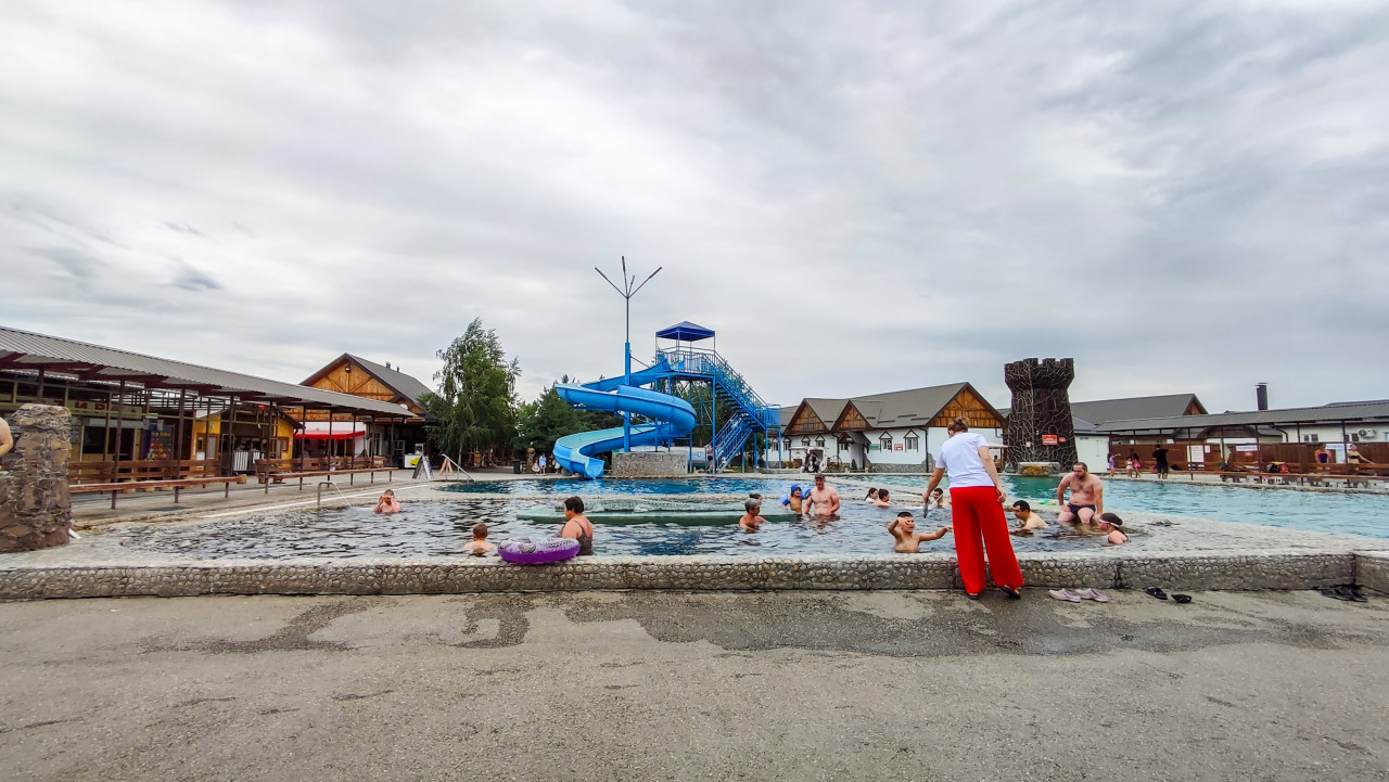 туризм путешествия отдых курорт термальный комплекс инфраструктура сервис общественное место гедуко панорама открытый бассейн аквапарк водная горка купание отдыхающие посетители дети семейный отдых туристический комплекс развлечения отпуск водная зона надувные круги бортик бассейна асфальт пляжная зона гостиница павильоны архитектура декоративная башня безопасность на воде пасмурное небо лето июль активный отдых ГедукоПохожие фотографии