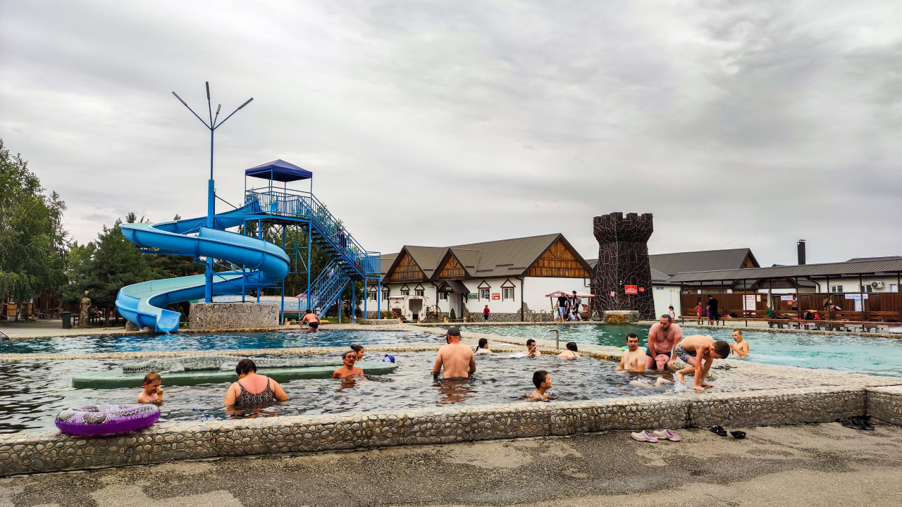туризм путешествия отдых курорт термальный комплекс инфраструктура сервис общественное место гедуко бассейн открытый бассейн аквапарк водная горка спиральная горка купание отдыхающие люди дети надувной круг семейный отдых туристический комплекс отпуск развлечения вода гостиничные корпуса архитектура декоративная башня пляжная зона безопасность пасмурное небо лето июль активный отдых городская среда ГедукоПохожие фотографии