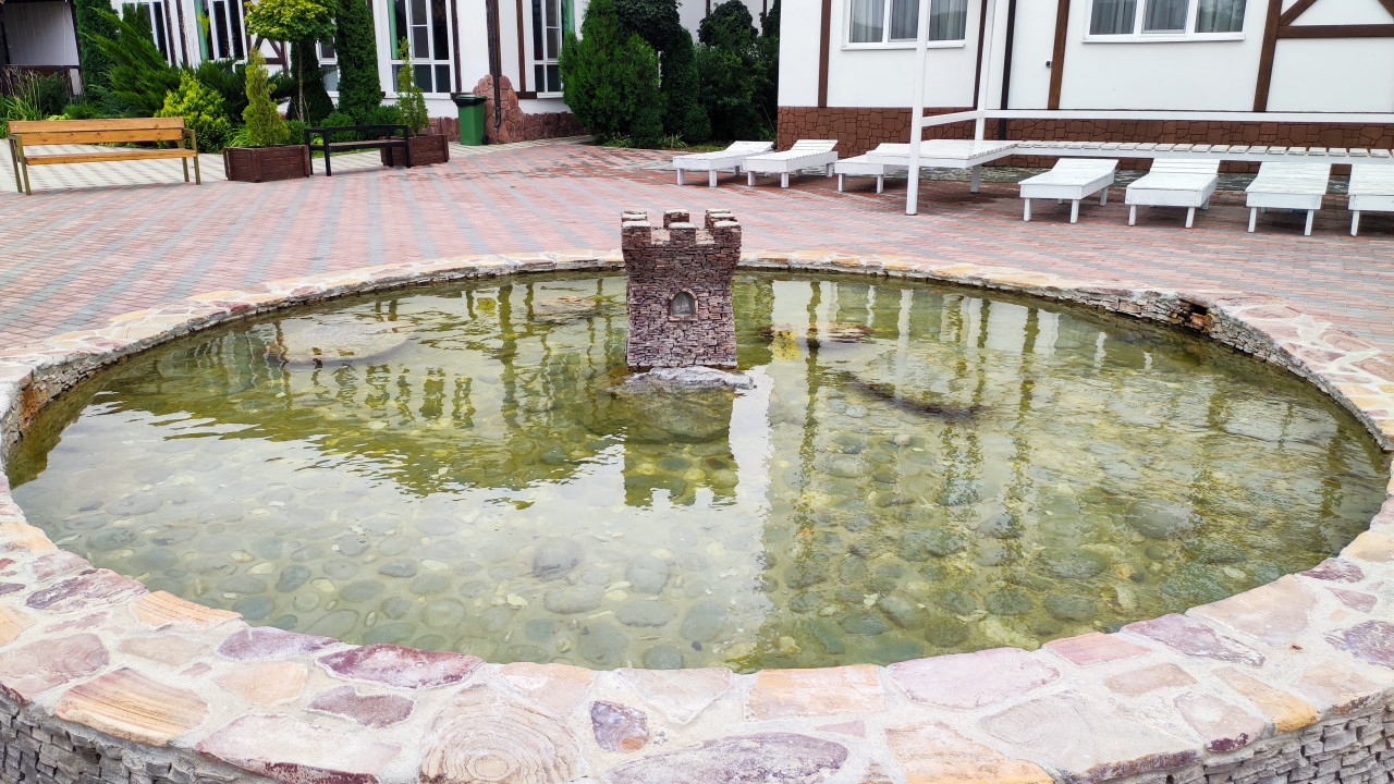 В кадре круглый неглубокий водоём с прозрачной водой и галечным дном, по центру установлена декоративная каменная башенка, стилизованная под крепостную. Бортик выполнен из природного камня с неровной фактурой, по поверхности воды видны отражения зданий и растений. Вокруг водоёма вымощенная плиткой площадка, лавочки, деревянные кашпо и ряд белых лежаков у фасада. Съёмка на улице при рассеянном дневном свете. Фотография подходит для тем о благоустройстве территорий, дизайне дворов, курортных зонах отдыха и декоративных водных объектах.