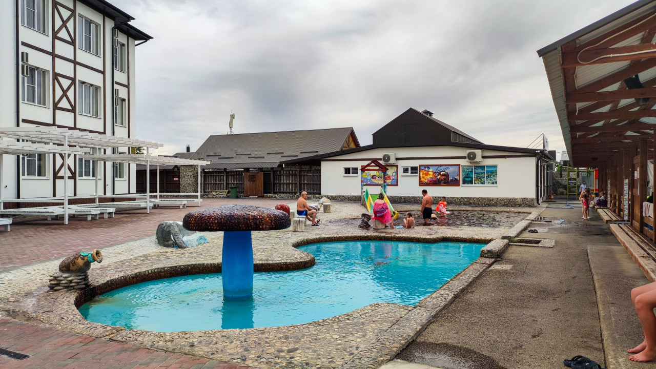 туризм путешествия отдых курорт термальный комплекс инфраструктура сервис общественное место гедуко бассейн открытый бассейн аквапарк водные развлечения семейный отдых дети люди купание водная горка детская площадка фонтан гриб фонтан голубая вода плитка зона отдыха навес лавки лето пасмурно санаторий база отдыха двор комплекса отдых на воде рекреация досугПохожие фотографии