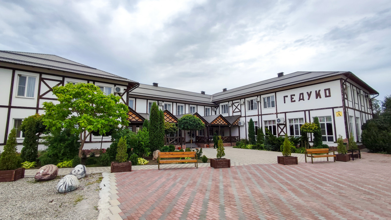 На снимке широкая площадка перед зданием с вывеской «ГЕДУКО»: фасад в стиле фахверк, ряд окон и кондиционеров, входная группа под несколькими навесами. Во дворе уложена плитка, установлены деревянные скамейки и вазоны с хвойными кустами, слева растёт дерево и расположен гравийный участок с крупными декоративными камнями, раскрашенными под животных. Озеленение выглядит ухоженным, дорожки чистые, свет дневной при облачном небе. Фотография подойдёт для иллюстраций о туристических объектах, благоустройстве территорий и оформлении зон отдыха.