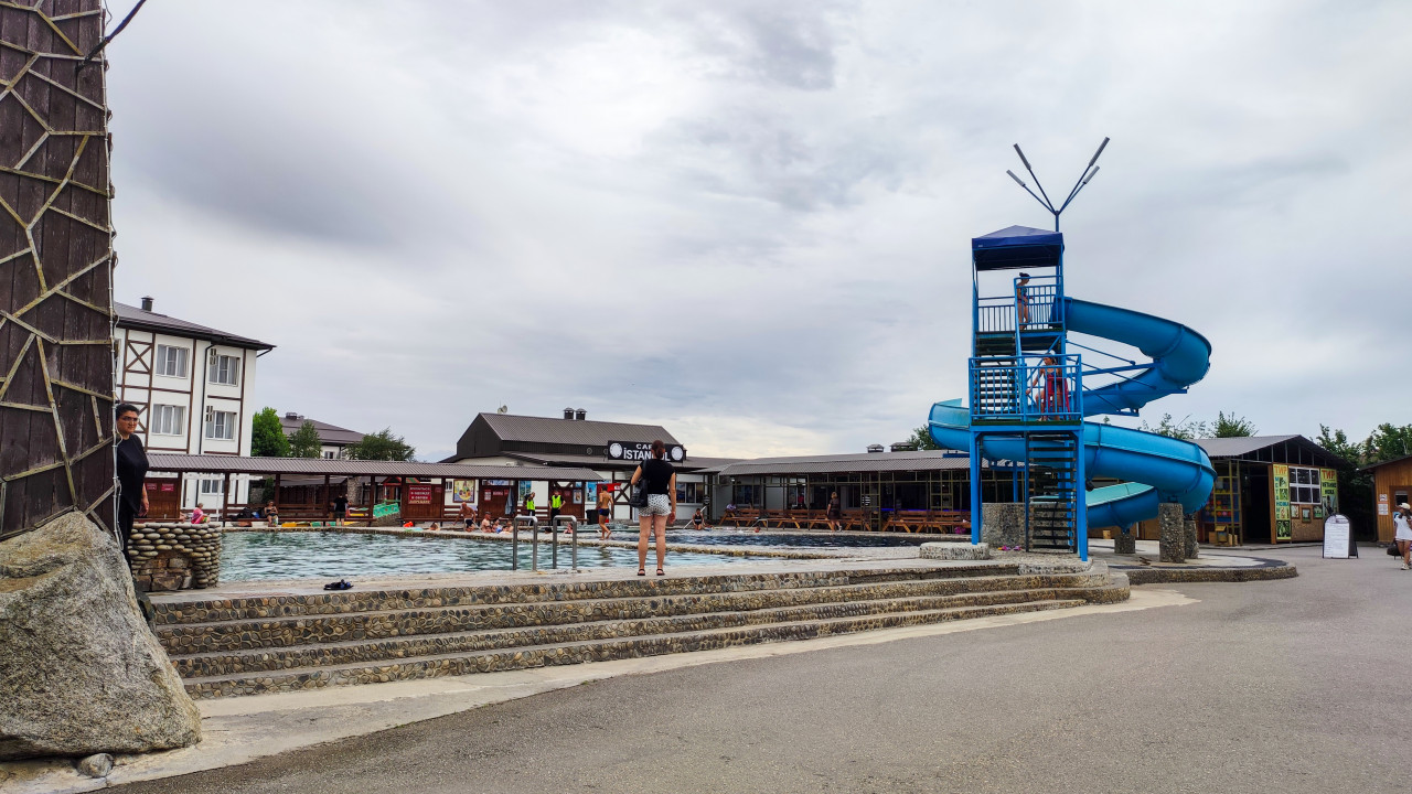 туризм путешествия отдых курорт термальный комплекс инфраструктура сервис общественное место гедуко бассейн открытый бассейн аквапарк водная горка аттракцион зона отдыха кафе павильоны лавки навес ступени каменная окантовка галька дорожка посетители люди семейный досуг лето пасмурное небо рекреация оздоровление Istanbul кафе Istanbul водные развлеченияПохожие фотографии