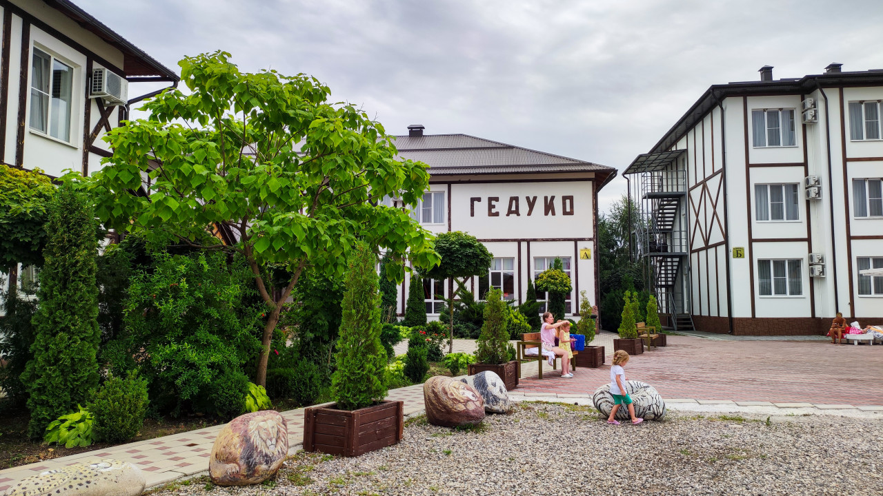 Дворовая территория комплекса «Гедуко»: белые корпуса с тёмным декоративным каркасом образуют уютный внутренний двор, на центральном здании крупная надпись с названием. Вдоль дорожек высажены кустарники и хвойные, стоят деревянные кашпо и скамейки. На гравии размещены декоративные валуны с росписью животных, рядом играют и отдыхают дети. Покрытие двора комбинированное: плитка и ровные пешеходные зоны, вокруг аккуратные посадки. Пасмурное небо даёт мягкий дневной свет. Фото подходит для публикаций о туризме, семейном отдыхе, гостиничной инфраструктуре и благоустройстве территорий.