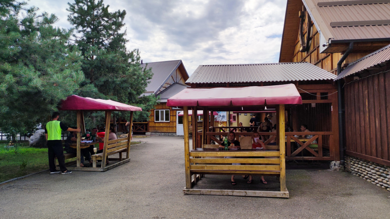 Деревянные беседки с лавками под тентами образуют зону питания у туристического комплекса